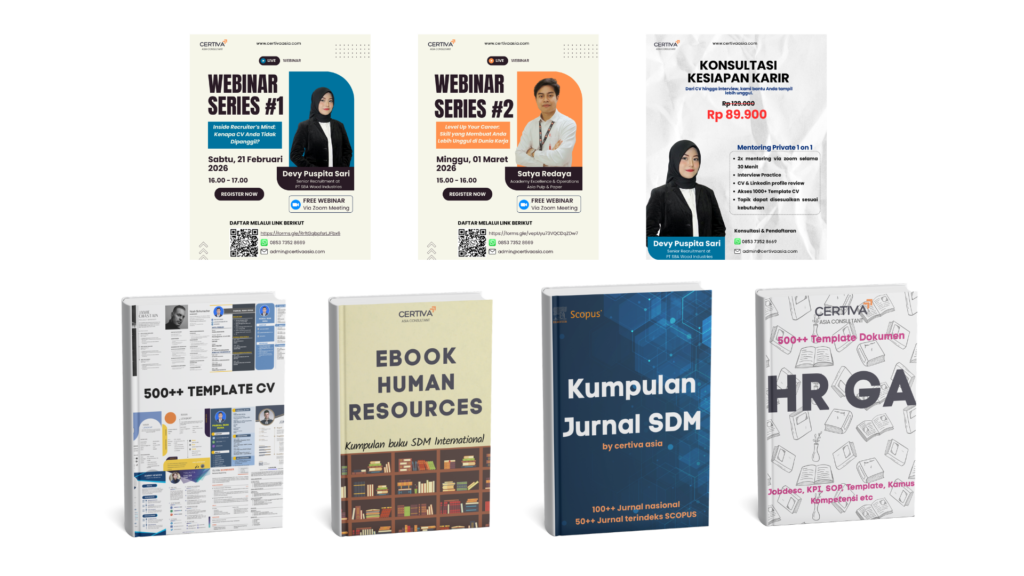 Nikmati gratis mengulang kelas, akses webinar eksklusif, konsultasi karier, grup alumni profesional, informasi lowongan kerja, jurnal SDM terbaru, e-book internasional, hingga ribuan template CV & tools HRGA yang siap pakai.