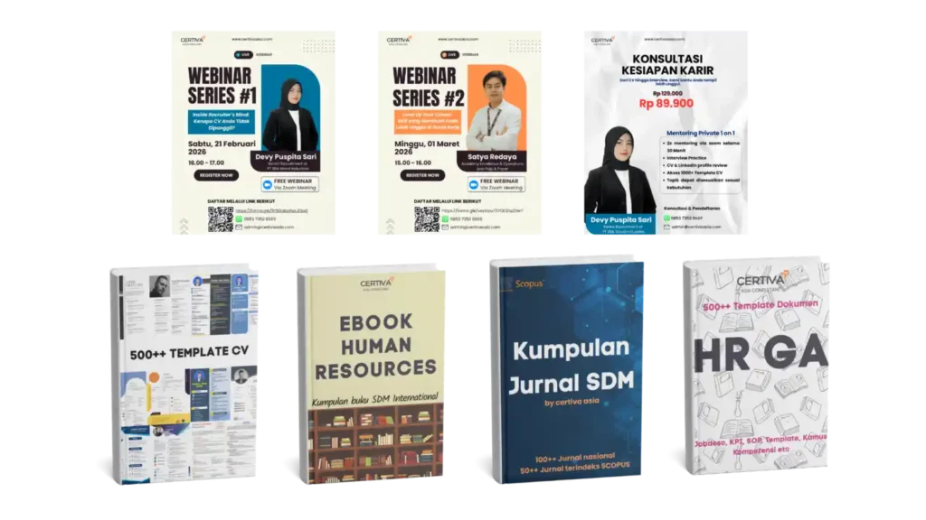 Nikmati gratis mengulang kelas, akses webinar eksklusif, konsultasi karier, grup alumni profesional, informasi lowongan kerja, jurnal SDM terbaru, e-book internasional, hingga ribuan template CV & tools HRGA yang siap pakai..
